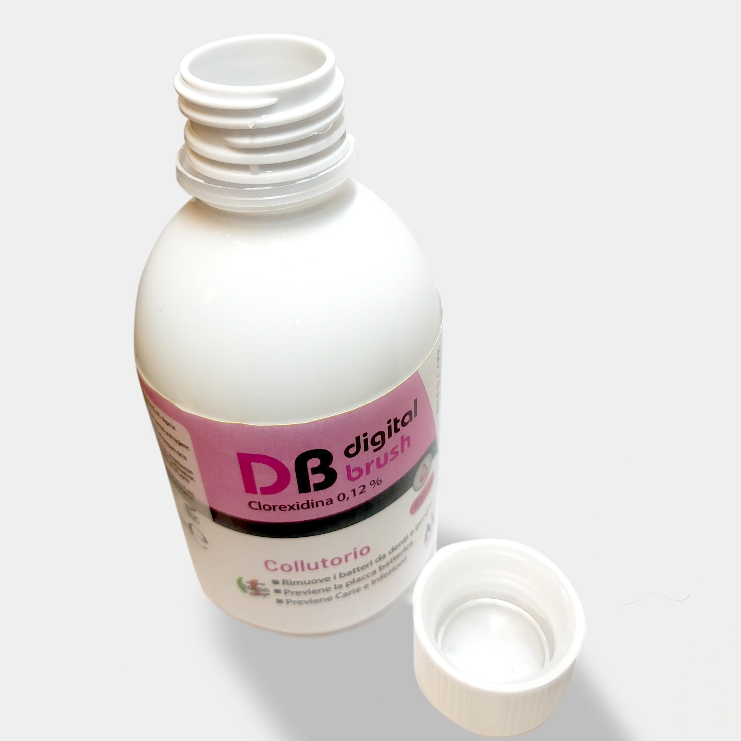 Il collutorio Digital Brush alla Clorexidina 0,12% asporta residui di cibo e batteri aiutando a prevenire la formazione di placca.